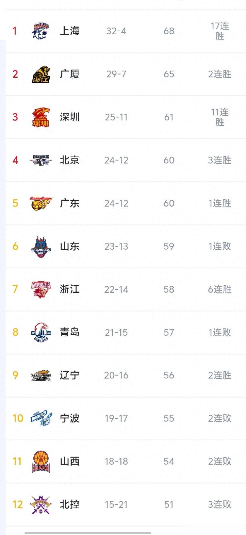 目前来看,前四行列里面,上海男篮和广厦男篮基本可以锁定前二的席位。深圳男篮一波11连胜,状态非常好,基本可以进入前四。