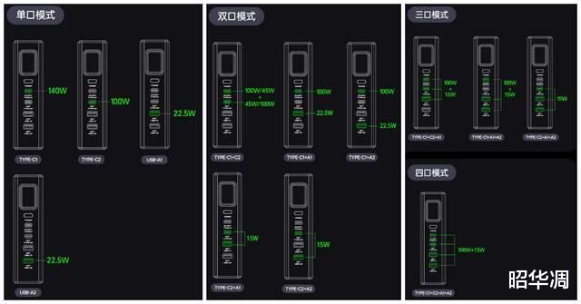 ▼两个 C 口在单独使用时可以激活最大 145W 功率,4 口同时使用为 115W, 具体分配逻辑如下图