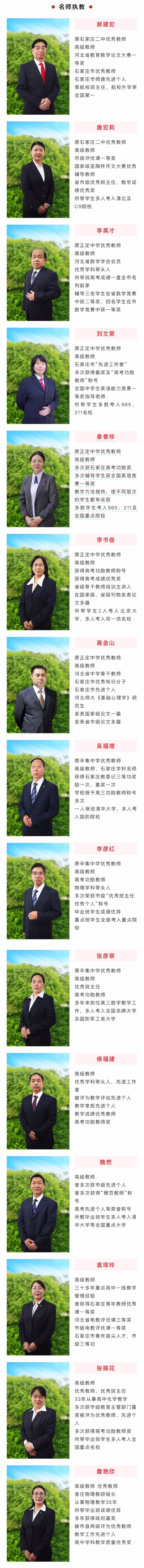 师资雄厚:目前,师资队伍老中青相结合,总量充足、结构合理、教学水平高、教研能力强。正中名师把关学科发展和高考备考的方向,来自985、211名校教师约25%,拥有研究生学历教师约20%,重点师范院校教师超过65%。采用“三备两研”的精准教研保障体系实行每日教研制度,保障精品课堂的高质量开展。
