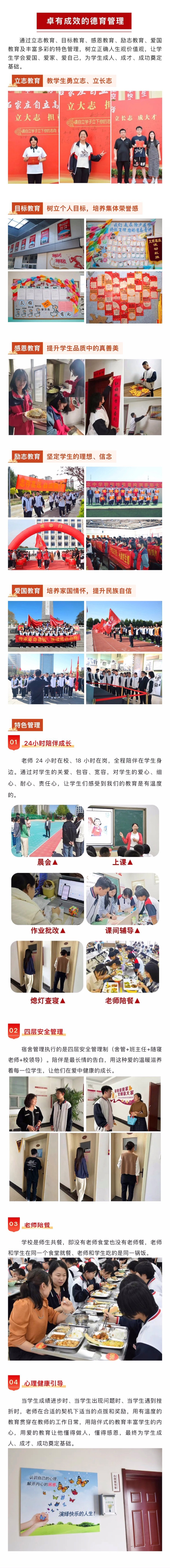 精细管理:全校封闭式管理,严格按照作息时间规划学生,培养学生自律性,不浪费一分一秒同时保证科学的休息睡眠时间,为学习成绩的提高保驾护航。确保学生健康成长,寓教于活动中,让学生阳光自信,让每一个学生乐学,让每一个学生进步。