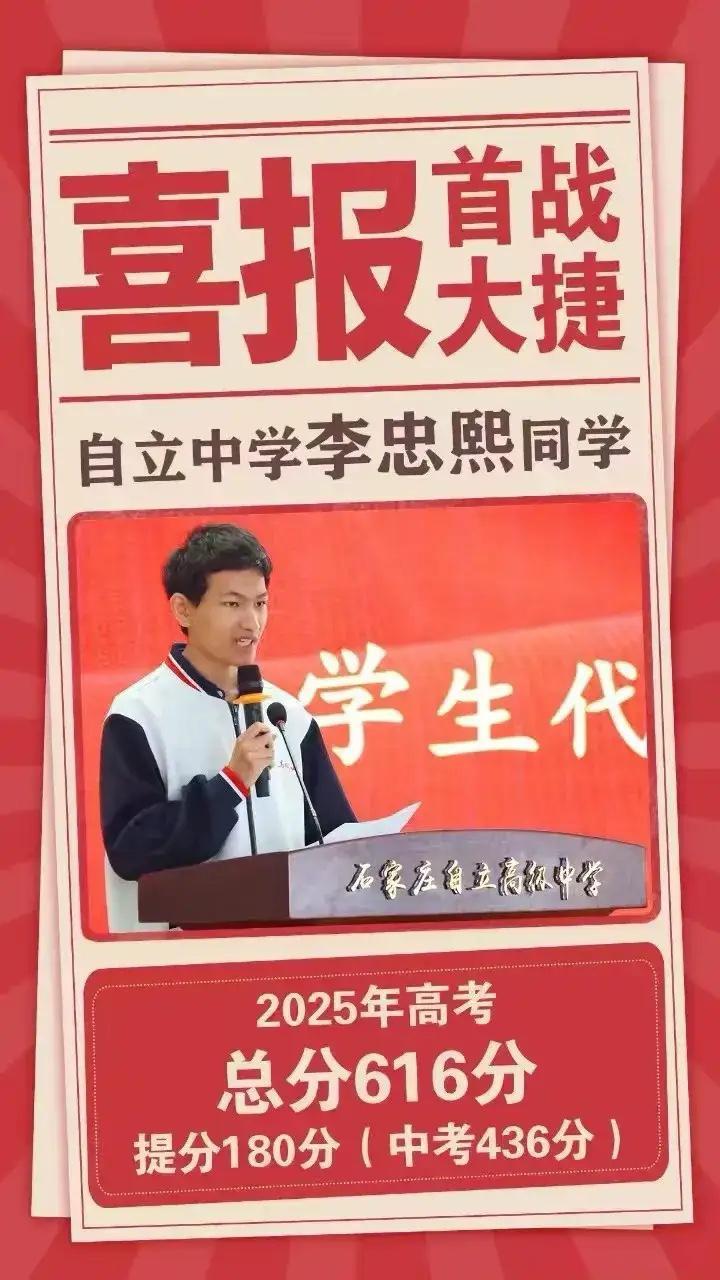 石家庄自立中学,作为第一年征战高考的民办高中,在三年前招生入口处于劣势的情况下实现了高考出口的突破。2022年高中录取线是424分(总分650分),550分以上的生源为0,更别说600分+的尖子生。2025年高考,自立中学克服困难争创高考开门红:550分+理科13人、文科9人,理科最高分李忠熙616分、提升180分,文科最高分王佳怡574分、提升111分,这个亮眼成绩对于一所新建高中来说非常了不起,用心打造了“低进高出”的成功典型。