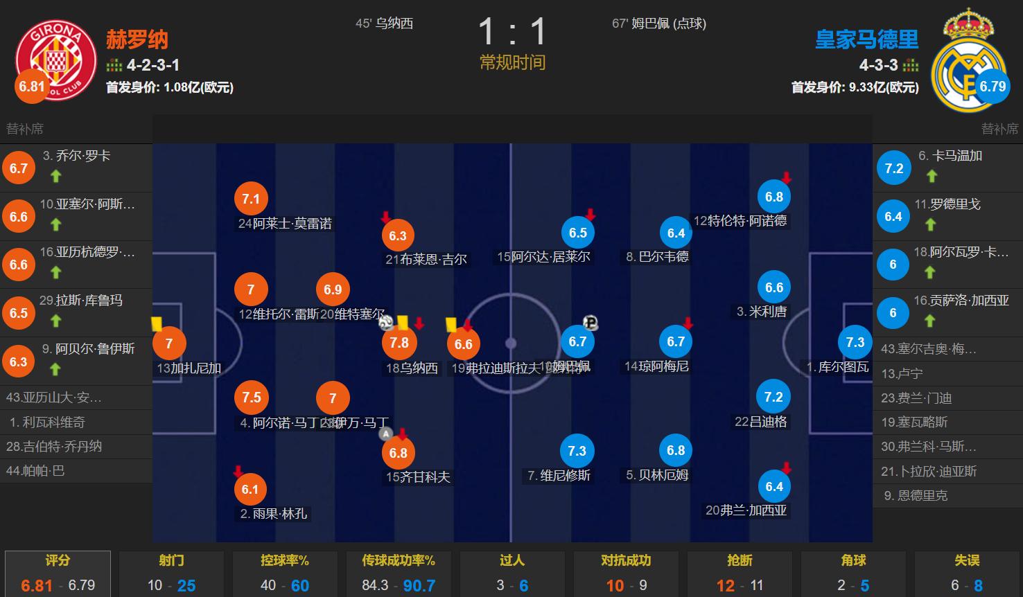 最终,皇马客场1-1赫罗纳,遭遇联赛三连平,拱手让出榜首位置,巴萨1分领跑。