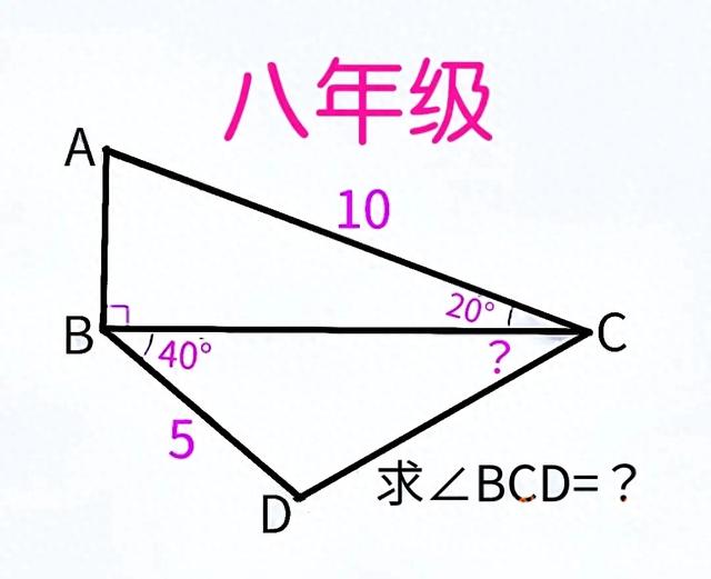 在四边形ABDC中,AC=10,BD=5,AB垂直BC,∠ACB=20°,∠CBD=40°,求∠BCD=?