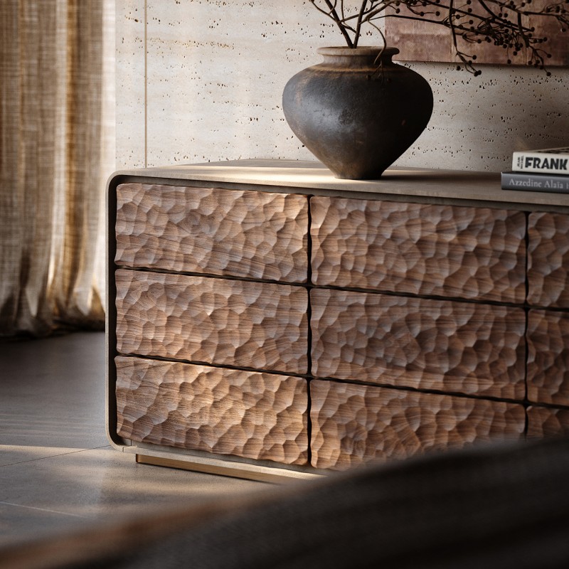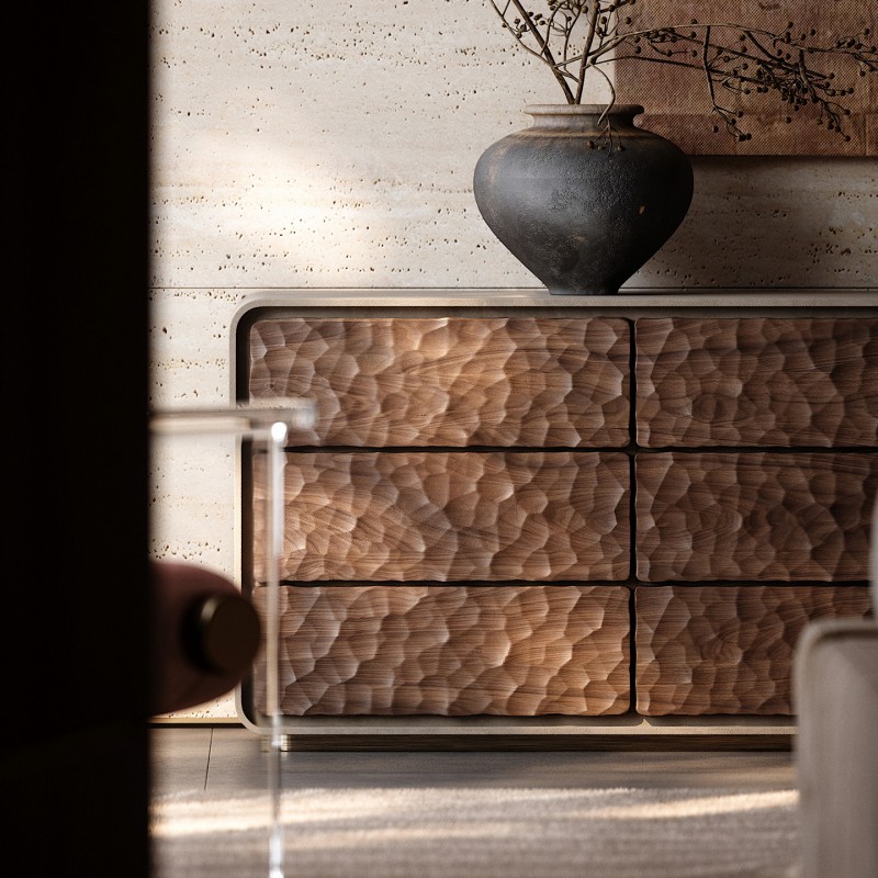 VISN「玲珑艺术雕刻柜」将金属锻造中的锤击肌理,巧妙转化为木器上的手作雕刻,在凹凸之间,为您的空间注入独特的现代肌理。