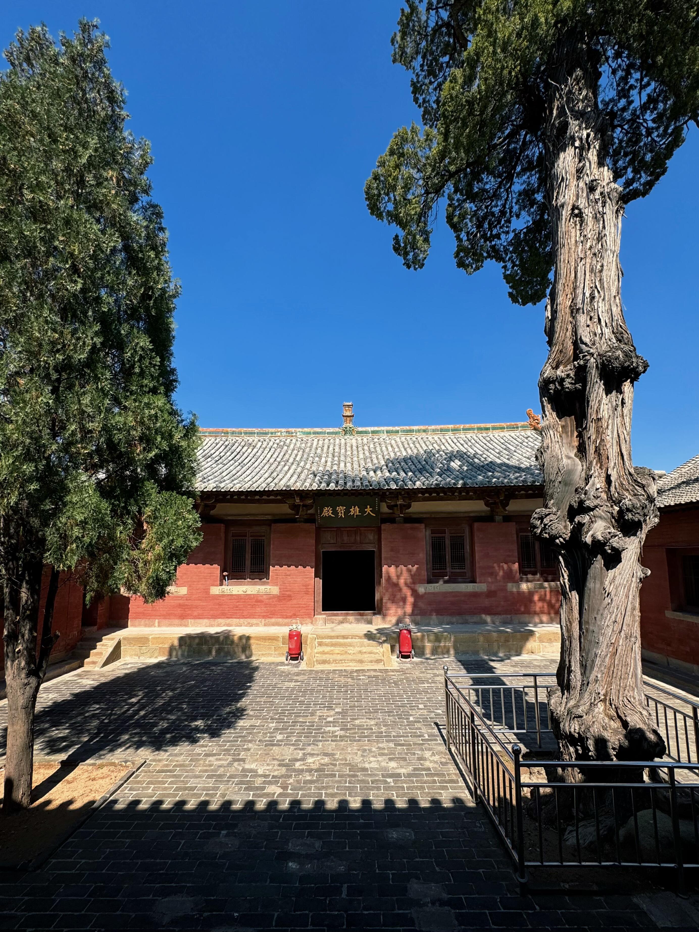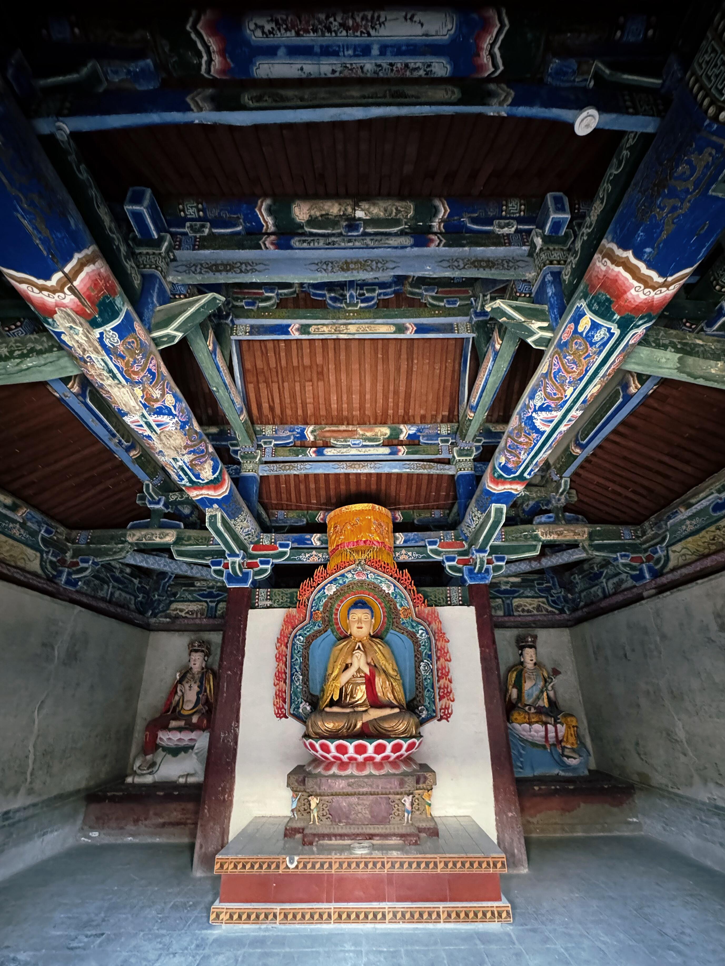 继续沿着中轴线向后走,便是后殿,如今的大雄宝殿,清以前名为三佛殿。这里供奉着三尊佛像,代表着佛教中的过去、现在与未来。大雄宝殿的建筑风格与毗卢殿一脉相承,但规模更为宏大。殿内的空间开阔,让人感受到一种庄严肃穆的氛围。站在殿内,抬头仰望,屋顶的藻井精美绝伦,层层叠叠的斗拱,构成了一个复杂而又和谐的图案,让人不禁感叹古人的智慧与创造力。