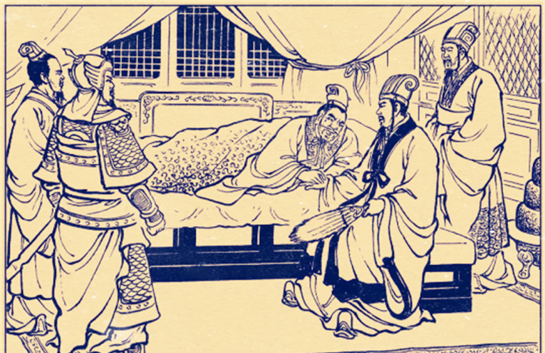 公元223年,刘备病重,卧床不起一年多,自知大限已到,于是召来丞相诸葛亮和尚书令李严来到永安,交代后事(托孤)。他自知自己的儿子刘禅天资愚笨,于是对诸葛亮说道:“君才十倍曹丕,必能安国,终定大事。若嗣子可辅,辅之;如其不才,君可自取。”诸葛亮是大忠臣,岂能篡夺刘备辛辛苦苦打下来的基业,于是不停跪拜,涕泪横流。刘备临终前,再三叮嘱太子刘禅要像对待他一样对待诸葛亮,称呼诸葛亮为“相父”。刘禅谨记于心,对诸葛亮倍加信任,朝廷有什么重大事情都会亲自来到诸葛亮府邸,请教诸葛亮的意见。