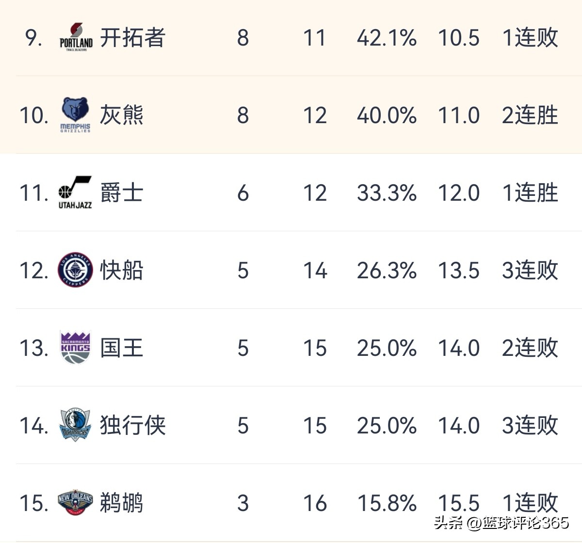 2.快船3连败,威少206次三双沦为空砍。目前开拓者战绩8胜11负,位列西部第9名。今日灰熊112-107击败快船,7人得分,杰克逊砍下最高的24分,伊迪豪取19个篮板,赛后灰熊8胜12负,位列第10名,占据附加赛区最后一个名额。第11名爵士128-119击败国王,马尔卡宁得到28+7+2,乔治31+5+6。今日快船107-112不敌灰熊,末节26-34遭遇翻盘,伦纳德空砍39分,哈登23+7+11,3连败的快船仅排名西部第12名。独行侠、国王、鹈鹕位列西部后三名,今日独行侠119-129不敌湖人,国王119-128不敌爵士,值得一提的是威少砍下生涯第206次三双16+12+14,遗憾的是沦为空砍。