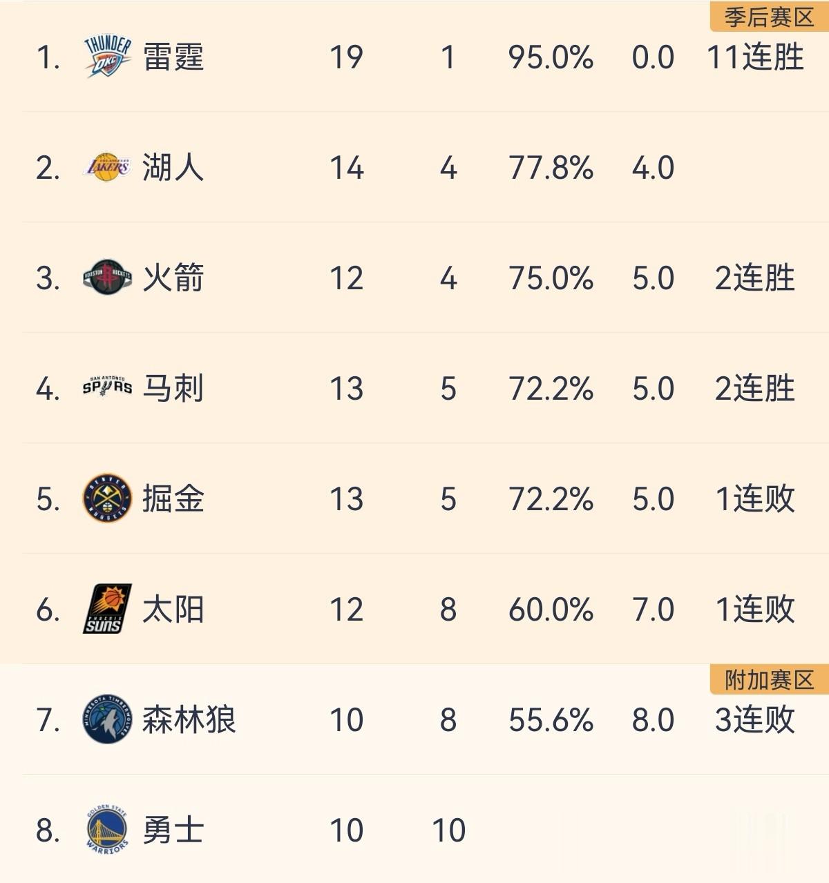 1.雷霆11连胜,霸榜榜首。今日雷霆123-119险胜太阳,豪取11连胜,霸榜榜首,亚历山大砍下37+3+8,霍姆格伦23分8篮板。湖人129-119击败独行侠,升至第二名,里夫斯砍下38+8+3,东契奇35+5+11,詹姆斯13+5+7。火箭凭借12胜4负,位列前三甲。今日马刺139-136险胜掘金,瓦塞尔砍下35分,尚帕尼25分10篮板;掘金约基奇空砍准三双21+9+10,默里37+4+7,约翰逊28分6篮板;赛后马刺和掘金战绩都是13胜5负,分列第4-5名。第6名太阳119-123不敌榜首雷霆,但却外卡晋级小组赛。森林狼和勇士分列第7-8名,近期都遭遇败阵。