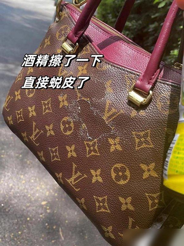 最搞笑的是我妈,她的真皮包喷了酒精消毒,结果包身的酒红色直接变浅,像被漂了色,原来的质感没了,变成粉紫色,再也没法背出门。