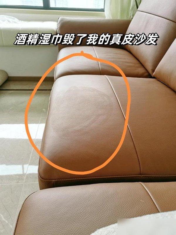 我同事上周刚踩了坑:她买的奶白色真皮沙发才用了三天,孩子把番茄酱滴在扶手上,她想着酒精消毒又去污,赶紧抽了张酒精棉片使劲擦。