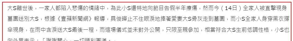 而媒体随后爆料称,大S的骨灰在家中时,具俊晔每天都会为她准备些她生前最爱吃的饭菜。