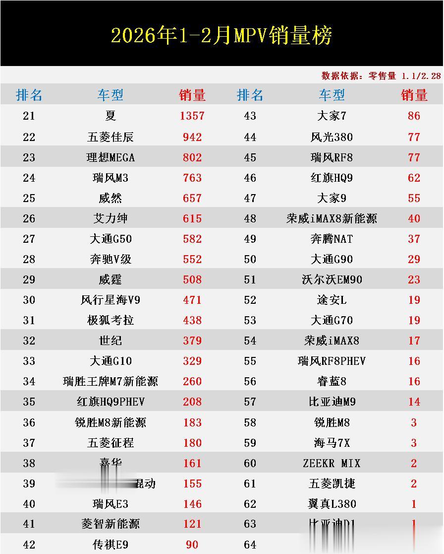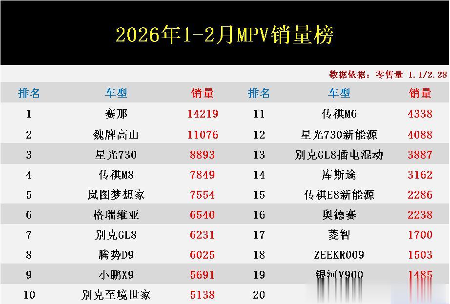 导读:近期,2026年1-2月MPV零售量排行榜已正式揭晓了!这个作为家用与商家首选的标杆市场,如今已然成为了各大车企的必争之地。从榜单数据来看,内部竞争格局呈现出明显的分层态势,前两名累计销量已突破万辆大关,而第3至第21名的车型也都分别售出了1357辆-8893辆不等的销量,但第22名以后各车型销量急剧下降至942辆以下,已被头部车型远远甩在了身后。其中丰田赛那以14219辆的销量成功领跑,魏牌高山则紧紧追随,星光730逆袭之榜单第三,格瑞维亚、别克GL8这两款老牌车型竞争力依旧尚存,排名都再次靠前。曾经持续占据榜单多月的腾势D9明星光环已不再,已被多款后期上市的车型超越,排名下滑至第9,小鹏X9、别克至镜世家都名列榜单前十。MPV别瞎买!1-2月销量排名:赛那夺冠,腾势D9第8,奥德赛第16