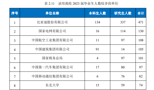 东北大学2023年学校积极开展房企扩岗活动,采取线上线下相结合的工作模式,保障毕业生就业市场规模与质量,众多国内重点行业的领军单位与东北大学开展了良好的人才合作,2023年中比亚迪股份有限公司录取东北大学毕业生总计471人,其中本科生有134人,研究生有337人,国家电网有限公司录取东北大学2023年毕业生总人数为130人,其中研究生有114人。
