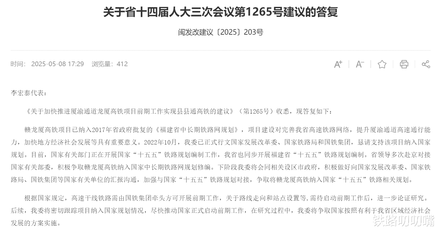 目前我国正在推进中长期铁路网规划修编以及“十五五”铁路发展规划编制工作,龙岩市在总结2023年工作的时候就表示国铁集团已初步同意将赣龙厦高铁列入新一轮《中长期铁路网规划(2035)》,除此之外,福建和江西省级及沿线地市也都在官方答复中表示“争取将赣龙厦高铁纳入国家“十五五”铁路相关规划”。