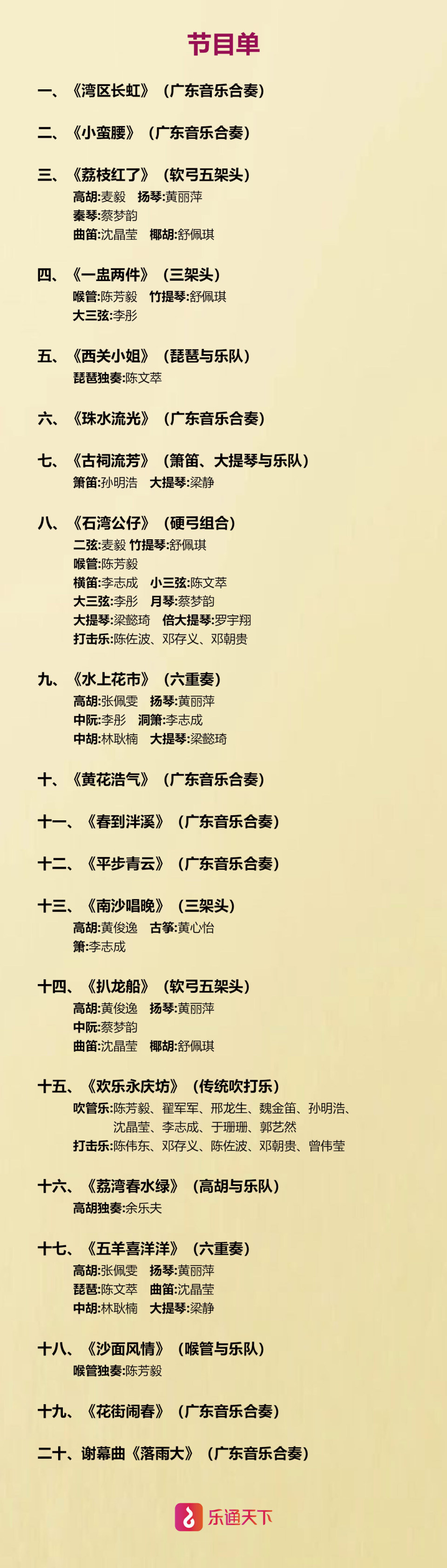 音乐会演出的原创广东音乐新曲目,题材丰富,内容多样,全部取材于珠三角大地的风土人情。其中不仅有描绘广州风土人情的《花街闹春》《荔湾春水绿》《古祠流芳》《欢乐永庆坊》《沙面风情》《春到泮溪》《小蛮腰》等新作,还有表现大湾区新时代风貌的乐曲《湾区长虹》等。