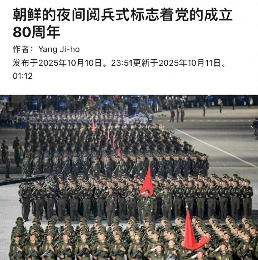 10 月 10 日是朝鲜劳动党建立 80 周年的纪念日,金正恩为此举行了盛大阅兵式。据韩国媒体监测数据显示,此次阅兵式于当地时间晚间 11 时后启动,持续至次日凌晨,以至于 10 月 11 日清晨,朝鲜媒体并未即时公开阅兵相关消息,直至后续一段时间才逐步披露。
