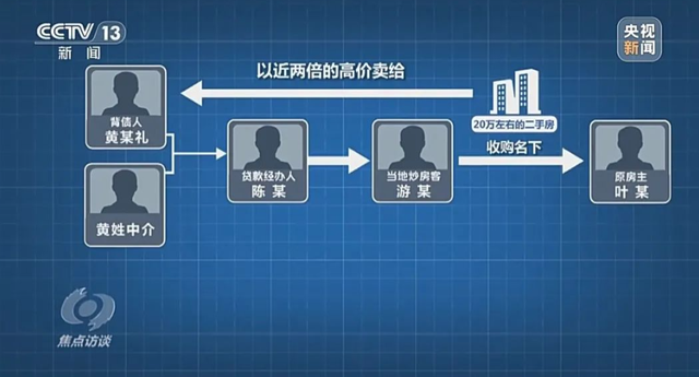 其次,这最好贷的大额款项就是房贷,于是陈某带着老黄买了当地炒房客游某的房子,把原本20多万的二手房以两倍的价格卖给了老黄,游某又找到了房贷中介范某办理过户手续和银行贷款,显然他们有着完整的“包装链”。