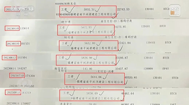 除此之外就是要看老黄的流水账户,记者从老黄的申贷档案中发现老黄居然有2023年3月到8月的六笔工资流水,而这些都是陈某他们伪造的,银行也依旧没有仔细查询就给办理了。