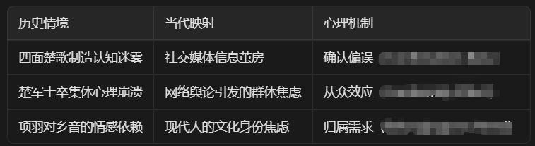认知颠覆:韩信刻意让汉军演唱楚地民歌,制造“楚国尽失”的假象,触发项羽的认知失调(心理学中当现实与信念冲突时的心理状态)