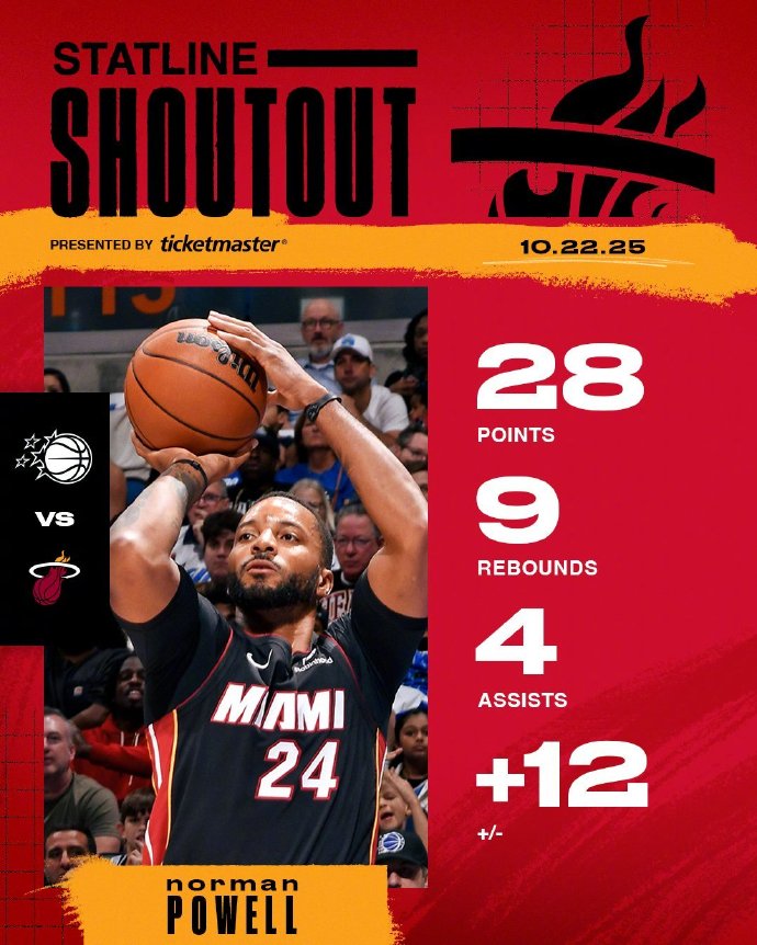 鲍威尔热火生涯常规赛首秀就砍下28分,超越巴特勒(21分)、韦德(18分)和奥尼尔(16分)等队史巨星的纪录,也是自2010年的詹姆斯(31分)以来,热火球员首秀的最高得分。