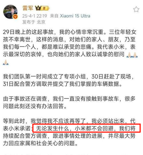 他说:“无论发生什么,小米都不会回避……并尽最大努力回应家属和社会关心的问题。”