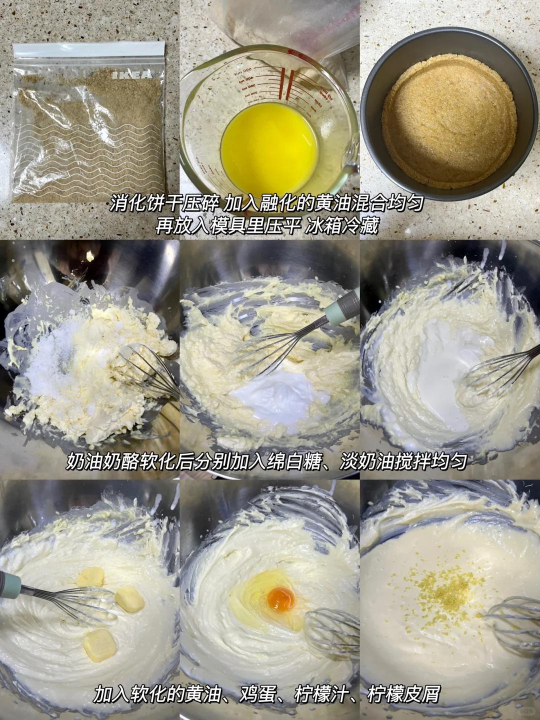 7寸模具,饼干底:消化饼干140g+无盐黄油100g、奶油奶酪400g、绵白糖68g、无盐黄油68g、 柠檬汁适量、柠檬皮适量、淡奶油 40g、鸡蛋 1个;