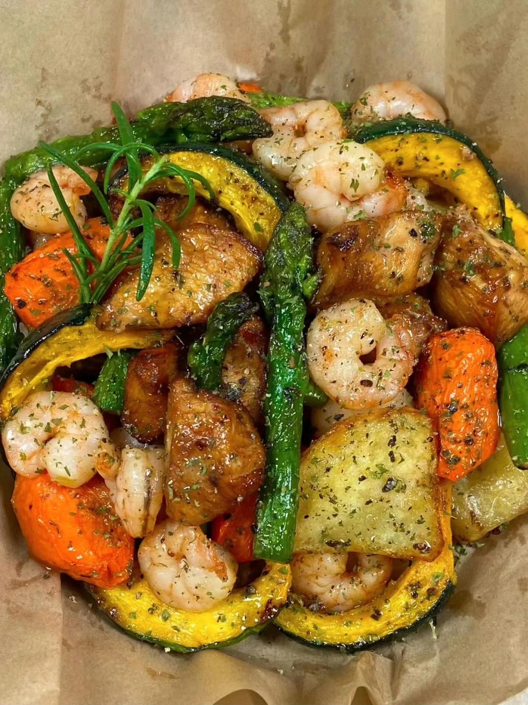 ③蔬菜铺底,鸡胸肉、虾仁铺上面,烤箱提前预热10分钟,200度烤30分钟左右就出炉啦!