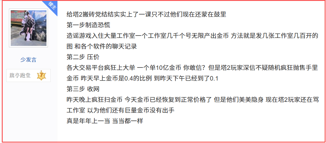 这帮商人的做法非常简单——首先制造恐慌,利用舆论炮制游戏中有渠道无线产出金币的消息,然后开始在各大平台上上虚假订单,压低金价,最后趁着市场上金价谷底的时候疯狂扫金。一套流程行云流水,短短三天时间就把虚拟市场搅了个稀巴烂,自己却从中渔利,美美隐身。