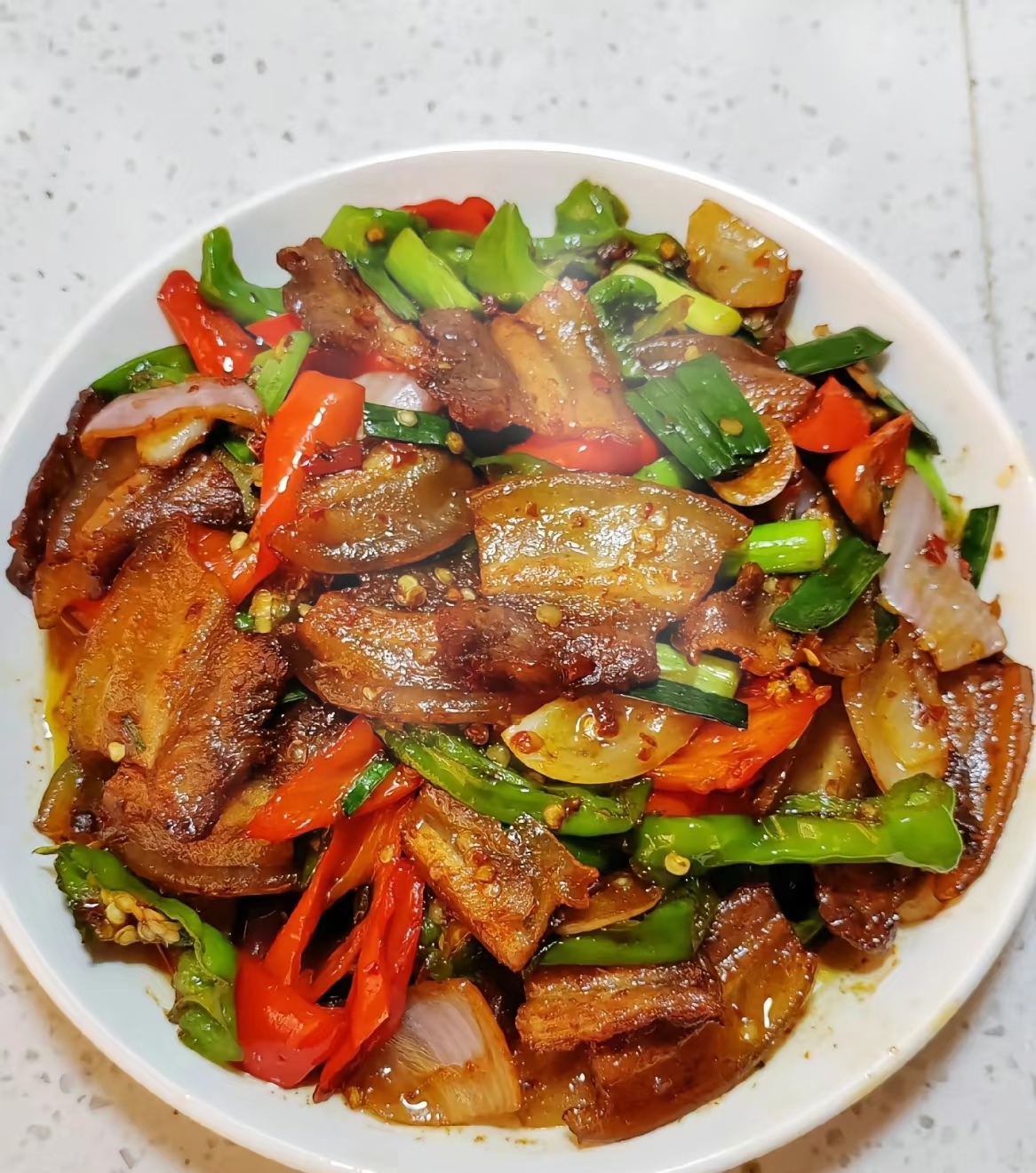 1. 将煸炒好的五花肉片重新倒入锅中,与调料一起翻炒均匀,让肉片充分吸收调料的香味。