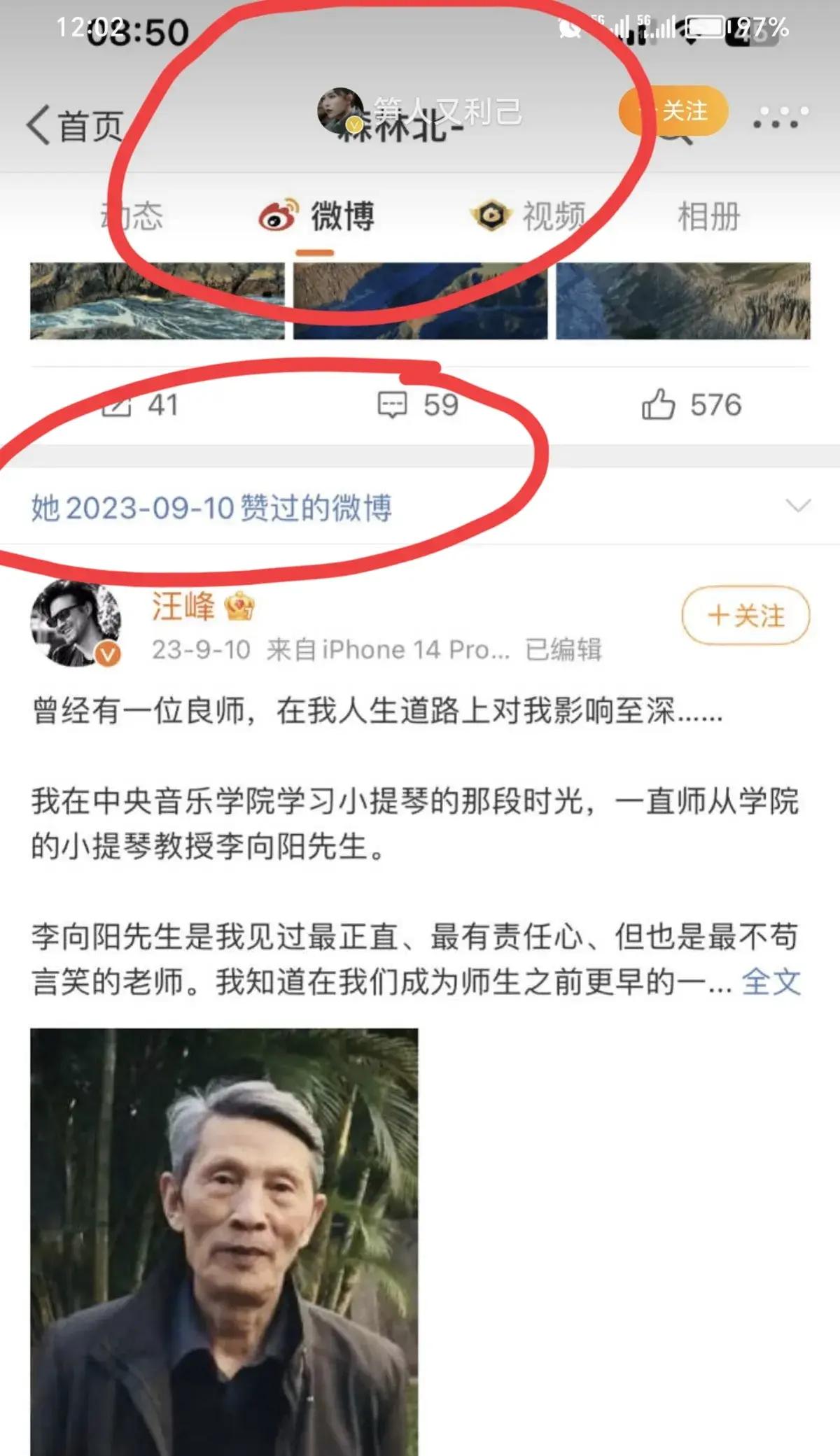网友们特别好奇他们俩是怎么走到一起的。经过一番搜索,发现了一个小线索。就是在2023年9月10号,森林北点赞了汪峰的一条微博,那是汪峰感谢小提琴老师的。这就说明他们可能在此之前就已经认识了。