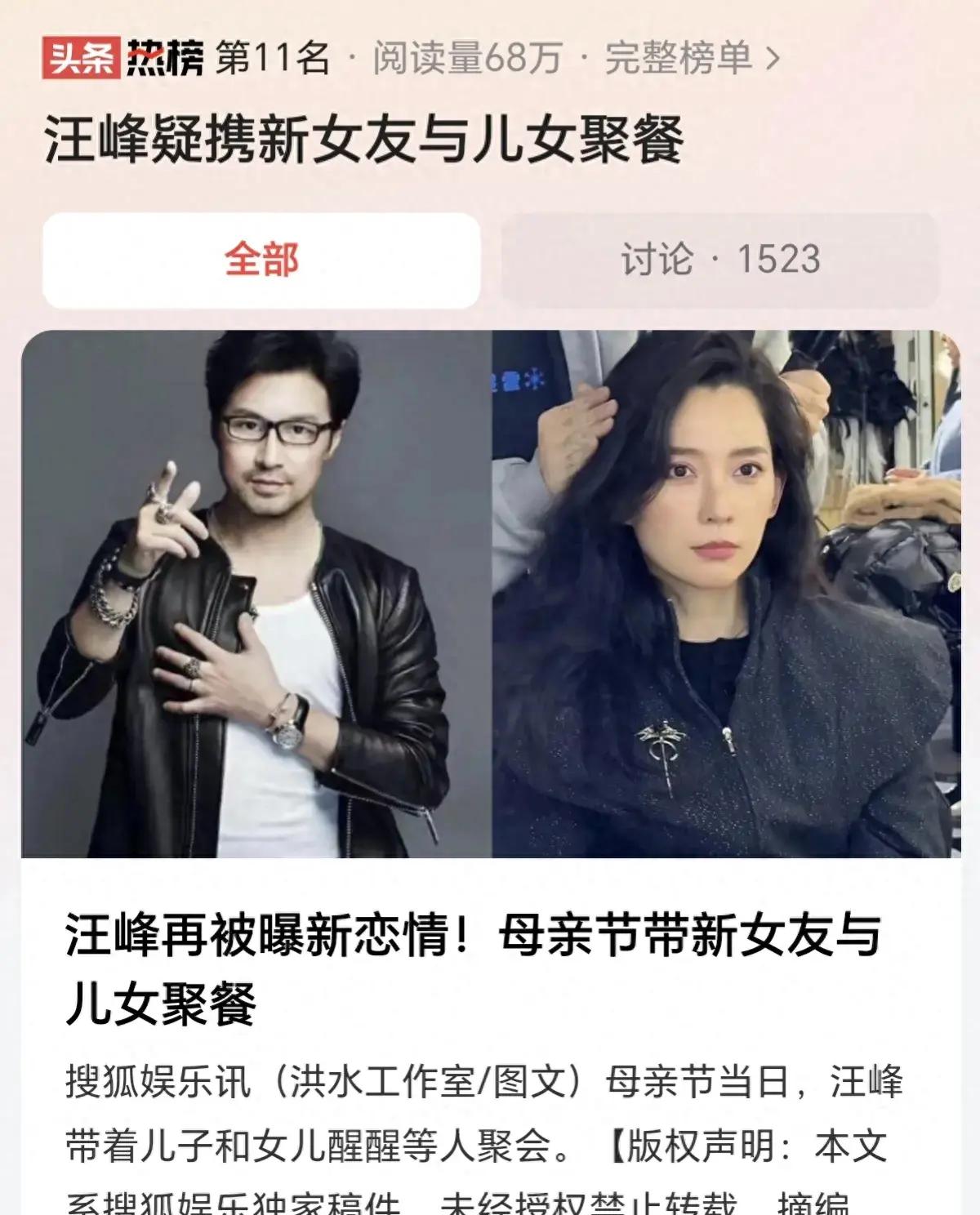 哎呀,一大早醒来就听说娱乐圈又出大新闻了,汪峰竟然又有新恋情!而且还是在母亲节当天,他还带着孩子们和新女友一起吃饭,还特别照顾他的女儿醒醒,这事儿真是让人惊讶。