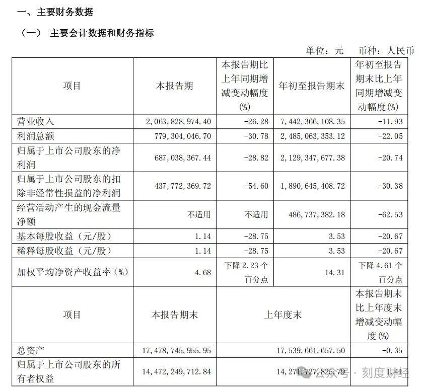从年初至报告期末的累计数据观察,业绩承压态势持续。公司前三季度累计实现营业收入7,442亿元,较上年同期同比下降11.93%。累计归属于上市公司股东的净利润21.29亿元,较上年同期的26.86亿元同比减少20.74%。营收与利润的双重下滑,使得过去三年公司通过双位数增长积累的业绩增量面临回吐压力。