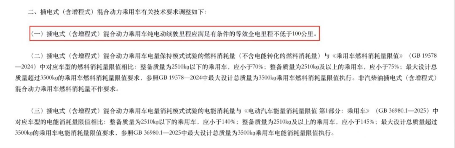 其中,要求插电式(含增程式)混合动力乘用车纯电动续驶里程应满足有条件的等效全电里程不低于100km。