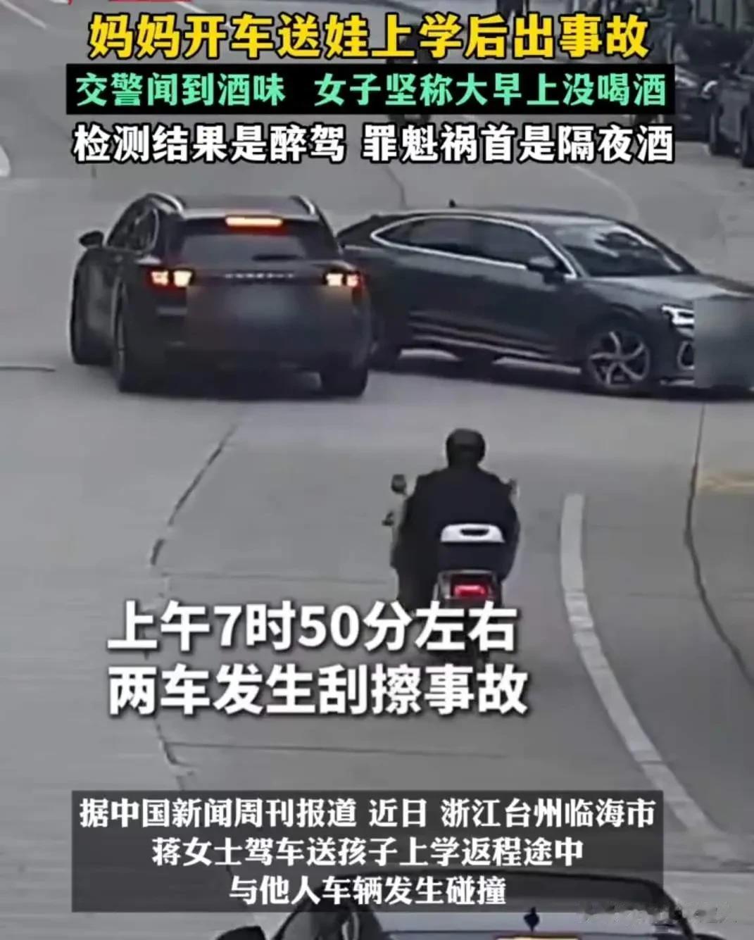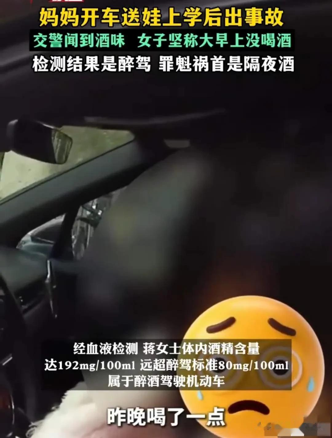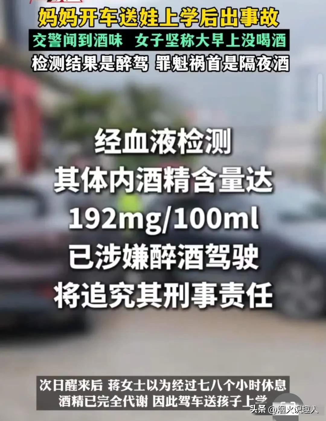 返程途中出事故。这意味着她送孩子去学校的路上,全程都是醉驾状态。