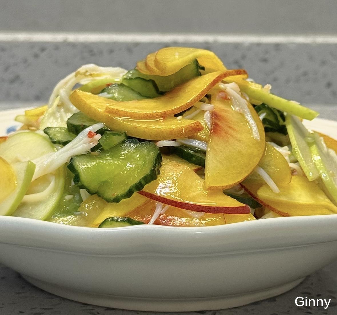 黄瓜切薄片,撒上盐搅拌后放置20分钟,再用水冲洗一下挤干备用,桃子、青苹果切薄片,蟹柳撕成条状,所有的食材放在一起,再淋上沙拉酱,搅拌一下就可以了。