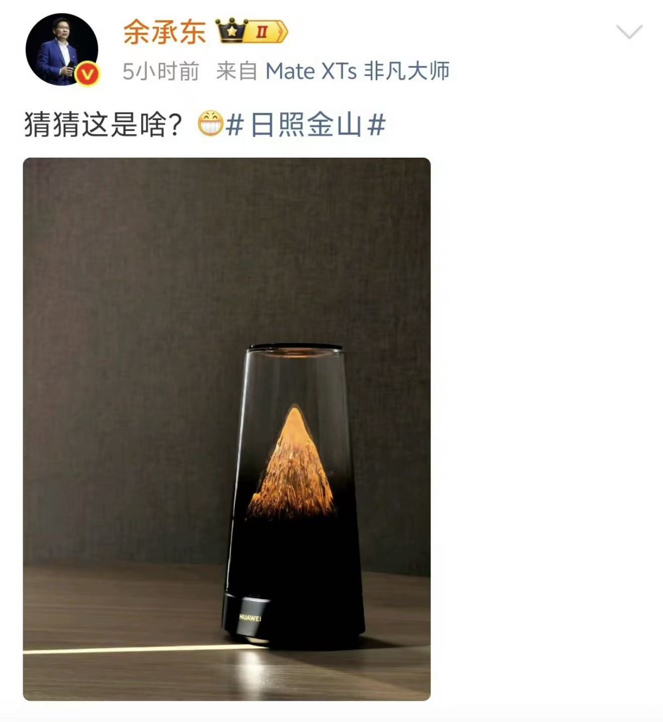 2025年10月15日,华为余承东在个人社交媒体发布神秘新品图,配文“猜猜这是啥?日照金山”,瞬间引爆热议。图片中产品采用透明上盖设计,内部呈现金色山体光影,搭配黑色底座与华为标识,“日照金山”的视觉意象极具辨识度。作为华为终端“悬念营销”的标志性操作,该动态发布2小时内相关话题阅读量破亿,网友纷纷化身“福尔摩斯”解析线索,印证了其对科技圈流量的强大号召力。