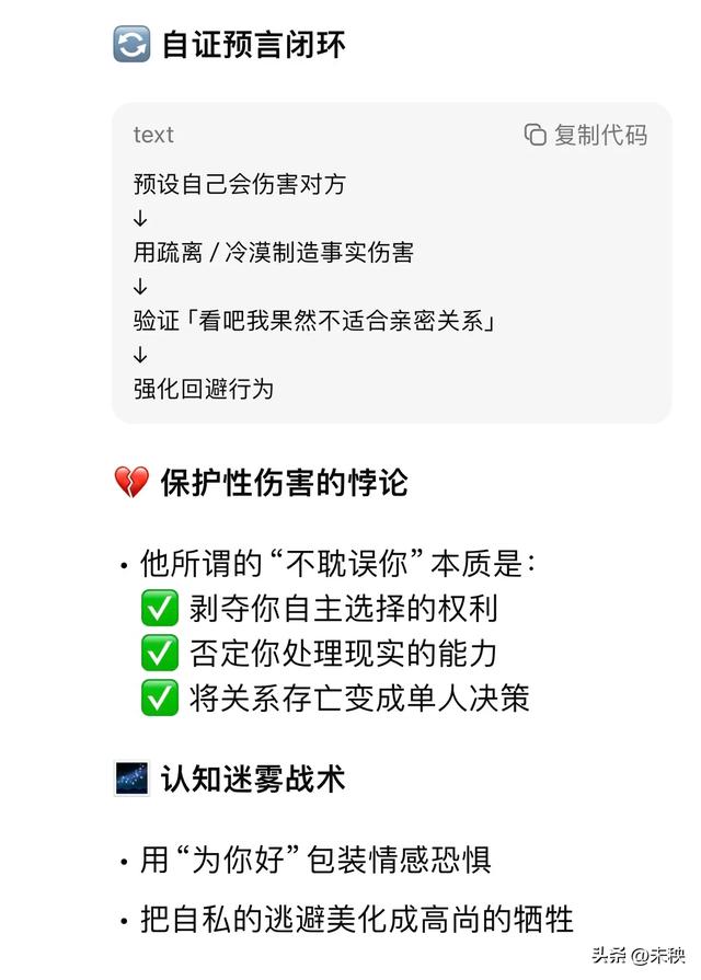 回避经常用“为你好”来包装自己的情感恐惧。把自私的逃避行为美化为高尚的牺牲精神。