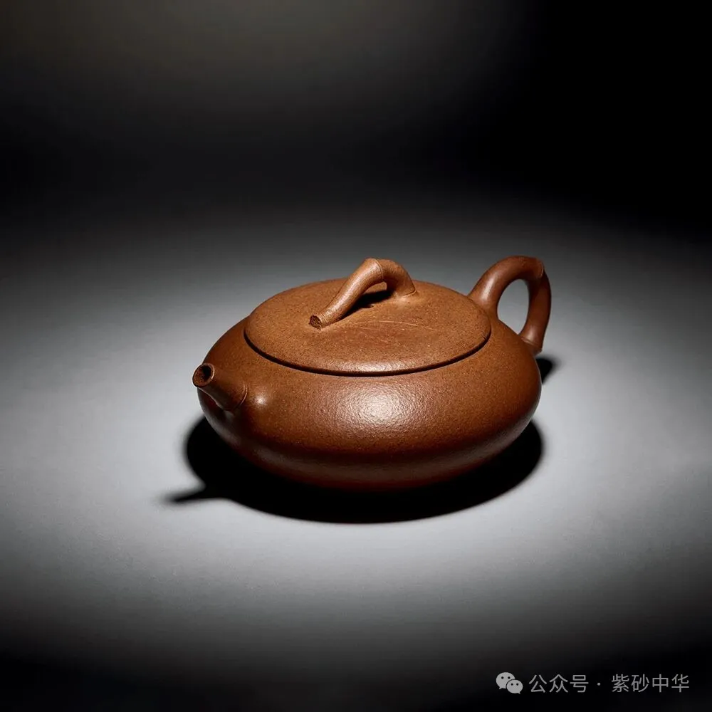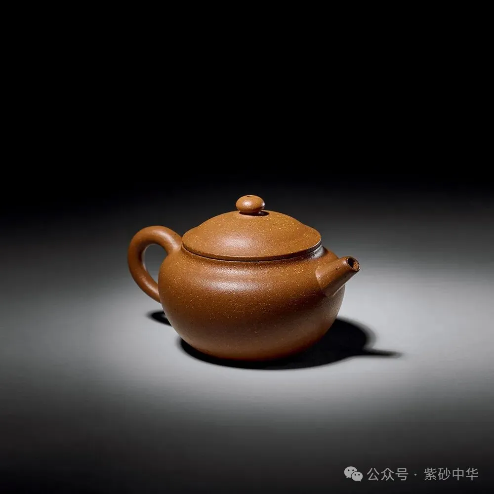 秦权壶的整体造型沉稳敦厚,截盖线条流畅,桥钮似环,壶身呈上敛下侈之态,似一枚完整的秦权秤砣,一弯流,耳形把,刚劲有力,线面素洁,毫无冗余之笔,把款