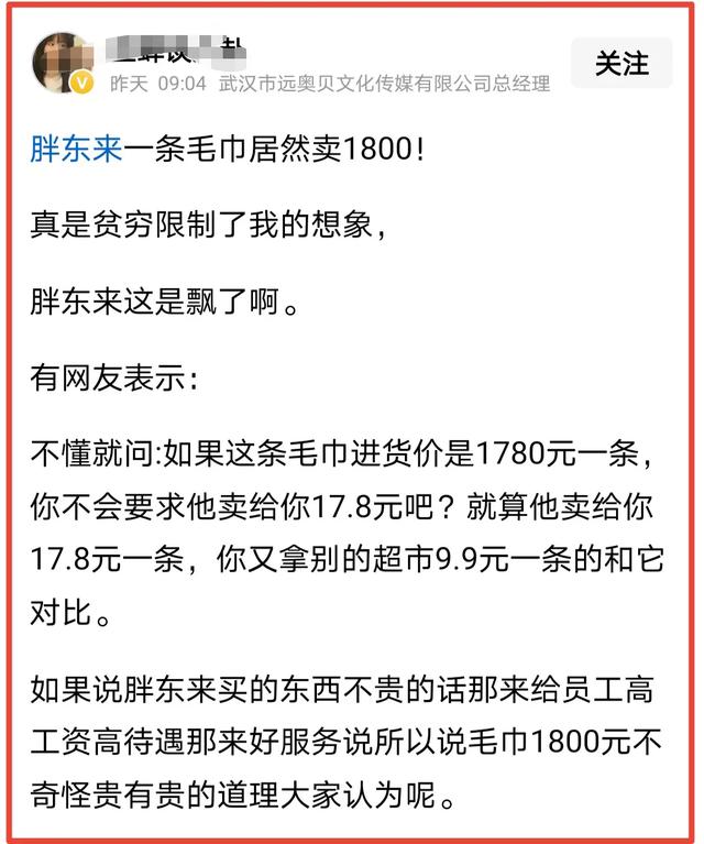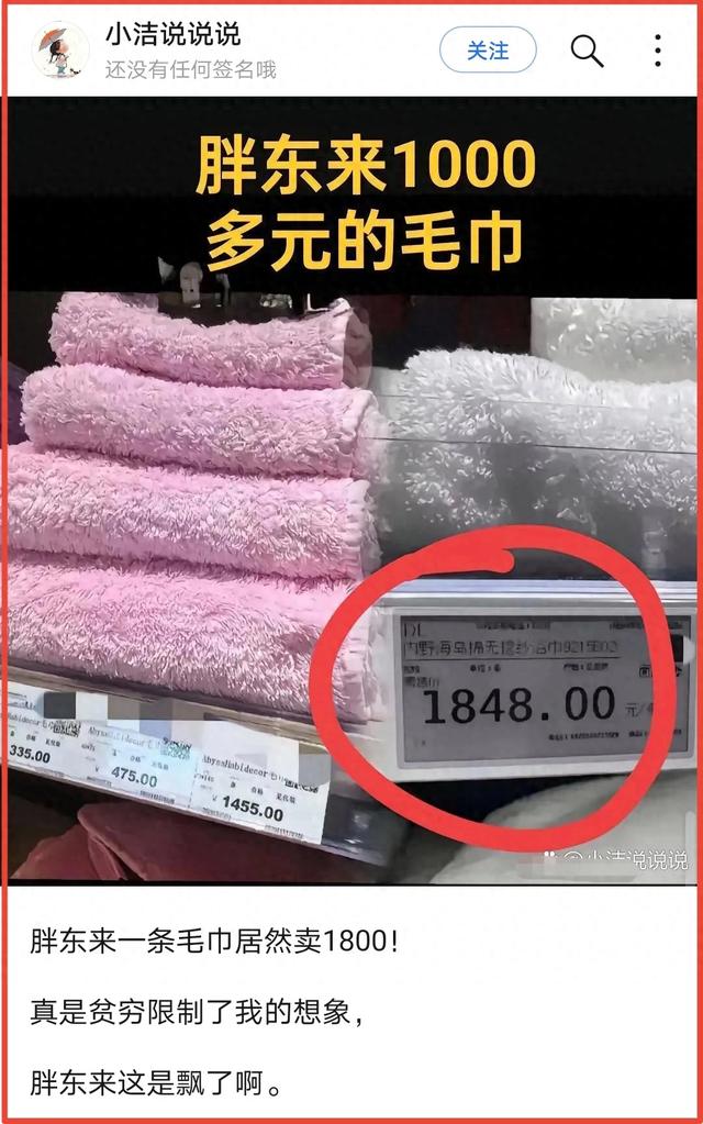 看上面这个人说:“胖东来一条毛巾居然卖1800!真是贫穷限制了我的想象,胖东来这是飘了啊。”