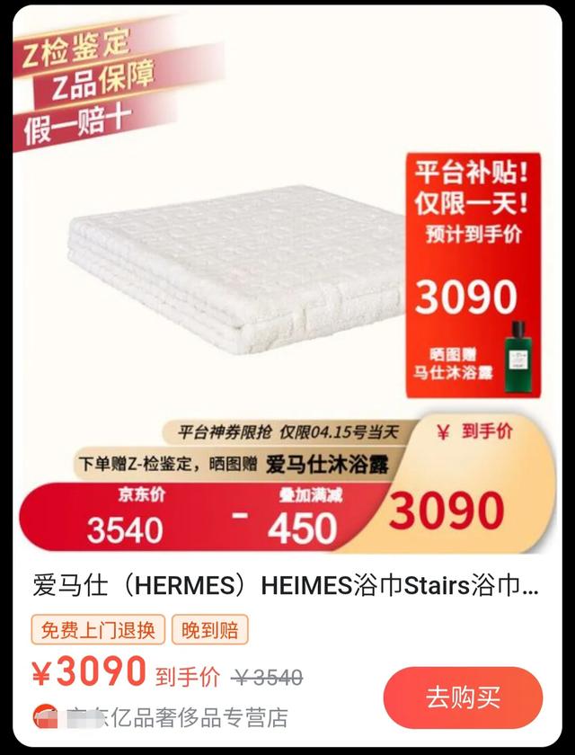 看看下面这个,爱马仕的浴巾,某东售卖的,三千多呢!比胖东来的贵多了。人家注明是“奢侈品”。
