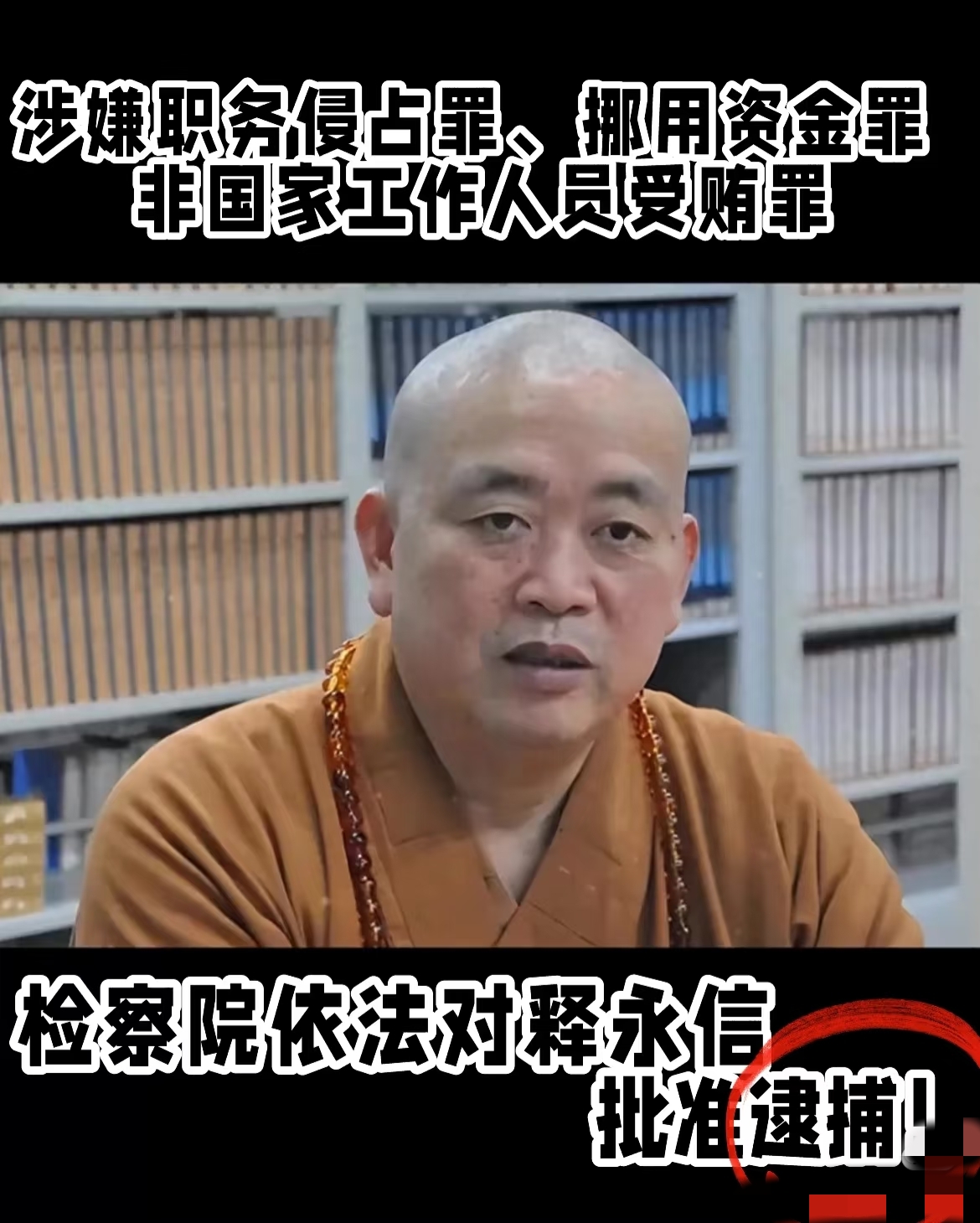 五:释永信被批捕嵩山少林寺原住持释永信涉嫌挪用资金等案件,经河南省公安厅指定由新乡市公安机关立案侦查,后由新乡市公安局提请检察院批准逮捕。日前,新乡市人民检察院依法以涉嫌职务侵占罪、挪用资金罪、非国家工作人员受贿罪对释永信作出批准逮捕决定。(新乡市人民检察院)