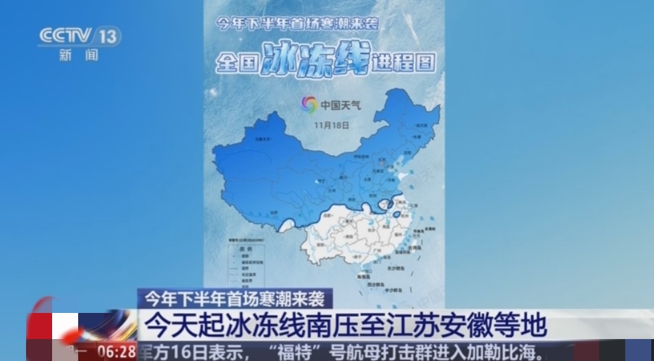 二:今年下半年首场寒潮来袭 17日起冰冻线南压至江苏安徽等地下半年首场强冷空气自北向南影响我国,此次寒潮波及范围广、降温幅度大、风力较强,结冰区域将扩展至湖北、安徽、江苏等地。