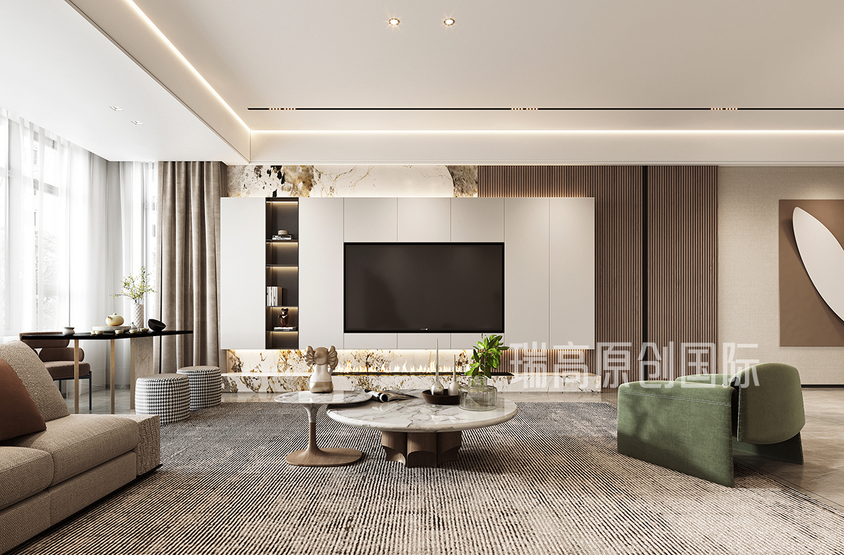 以米色和棕色为主色调营造温馨氛围。圆形大理石组合茶几、棕色布艺沙发与绿色单椅相搭配,既现代又充满自然气息,灯光运用恰到好处,突显出空间的舒适感。