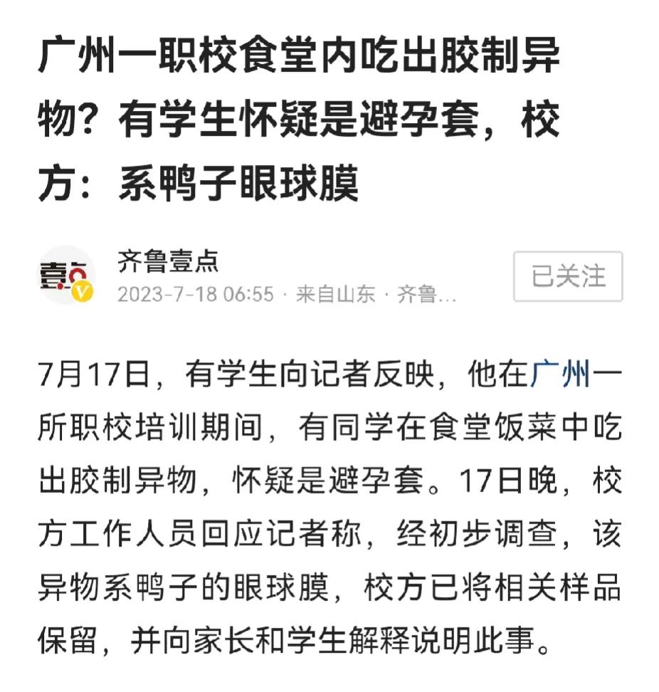 又是鸭子扛下了所有。鸭子:能不能换个动物啊。广州一职校食堂吃出橡胶异物,学生怀疑是避孕套,学校称是鸭子眼球膜。