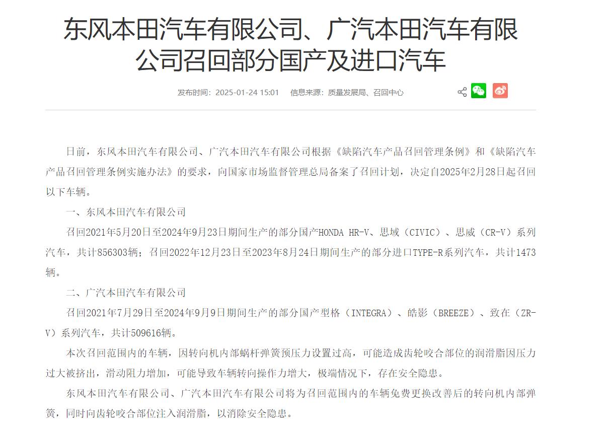 无独有偶,在中国市场,本田也将进行大规模召回。就在不久前,国家市场监督管理总局发布的消息显示,从2025年2月28日起,本田将会在国内车市召回136万余台车辆。