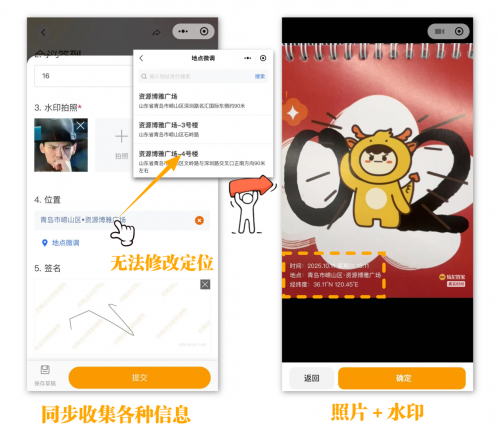 还能开启“水印拍照”,签到时自动在照片上添加时间、地点,最大限度保证签到的真实性。