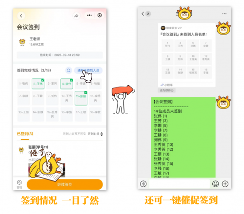 接龙管家会实时同步签到信息,可随时查看签到进度,还能一键催促参与者签到签退。