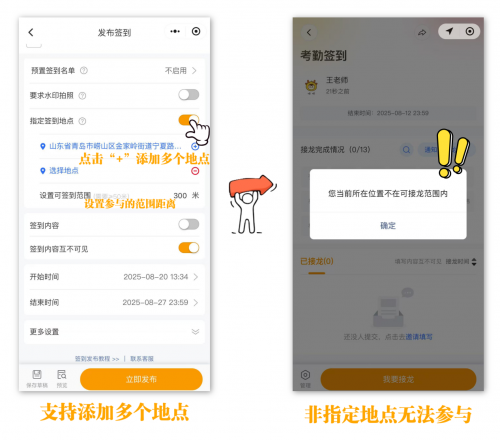 接龙管家可以设置签到范围(比如教学楼300 米内、操场区域),参与者只有到达指定地点,才能成功签到,其他地点无法签到。