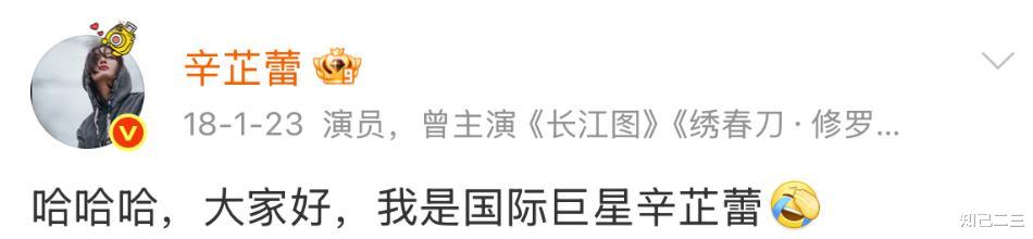 2018年,辛芷蕾在微博上发布了一条“哈哈哈,大家好,我是国际巨星辛芷蕾”的信息。