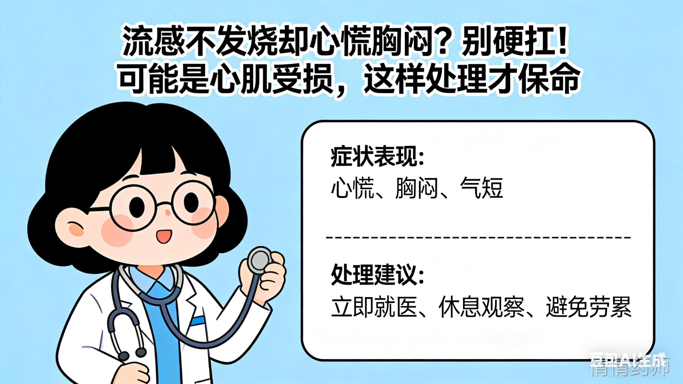 不发烧也心慌、心跳忽快忽慢、胸口闷痛、气短、头晕乏力、走两步就累得不行,这就不是正常反应了,是心脏在“求救”,大概率是流感引发了心肌损伤。